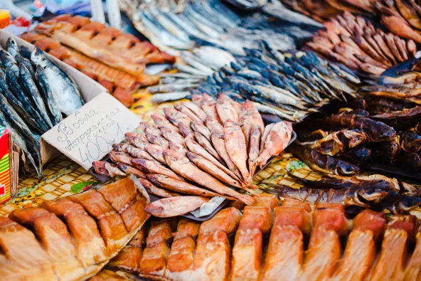 דוכן של דגים מיובשים ומעושנים בשוק פריבוז | צילום: jaras72 / Shutterstock.com