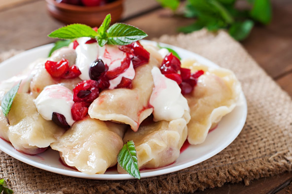 ממטעמי המטבח המקומי: כיסוני בצק ממולאים מוגשים עם שמנת חמוצה, דובדבנים וריבה