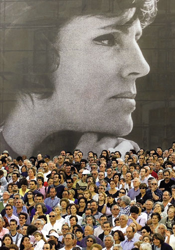 המונים על רקע תמונתה של אמליה רודריגז, מלכת הפאדו, בטקס העברת עצמותיה לפנתיאון בפורטוגל | צילום: Jose Manuel Ribeiro, רויטרס |