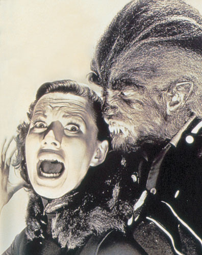 רגע של אימה מתוך הסרט "I was a Teenage Werewolf", 1957. "בסרט מפחיד, תמיד אפשר להדליק את האור. במציאות – לא. ובמקום שבו הסרט נפסק, מתחילה האימה של החיים" |