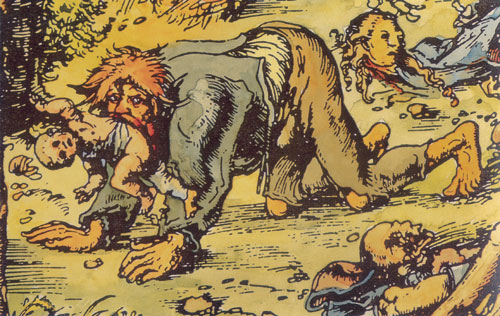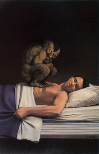 "הסיוט". "כשאתה בחושך, אתה לבד. נעלמים הסימנים המזהים שאליהם אתה יכול לקשר את עצמך, ואז הסרט מתחיל לבוא מבפנים. וכאשר הסרט בא מבפנים, אני מגיעים לעולם הפסיכולוגיה, לאותם חלקים בנפש שעוד לא למדנו להשתלט עליהם, ל'צל' בשפה היונגיאנית" ציור: דריל זודק, מתוך ספרו של ד"ר אילן קוץ "Dreamland Companion", הוצאת Hyperion 1993 |