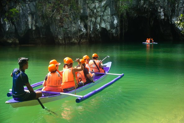פלוואן – חופים מהחלומות ונהר תת קרקעי האי פלוואן (Palawan) הוא אי בתולי שנחשב לאחד מהיפים ביותר בפיליפינים ובו יערות עבותים, שדות אורז ומטעי קוקוס, וכמובן, חופים חלומיים. אחד משיאי הביקור באי הוא השייט בנהר התת קרקעי של פורטו פרינססה (Puerto Princesa). זהו הנהר התת קרקעי הארוך בעולם, והוא אף זכה למקום של כבוד כשנבחר לאחד משבעת פלאי עולם הטבע. אורכו של הנהר 8.2 ק"מ, והוא זורם דרך מערות אבן גיר מרשימות עם נטיפים וזקיפים בשלל תצורות עד שהוא נשפך אל ים סין הדרומי. הנהר מהווה חלק מפארק מיוער שבו כמה מערכות אקולוגיות יוצאות דופן. הסיור במקום מתחיל בשייט עד הכניסה למערה, אז עוברים לסירת משוטים קטנה לשייט של כ-45 דקות.  סירות תיירים בכניסה למערה בנהר התת קרקעי פורטו פרינססה | צילום: Neale Cousland / Shutterstock.com
