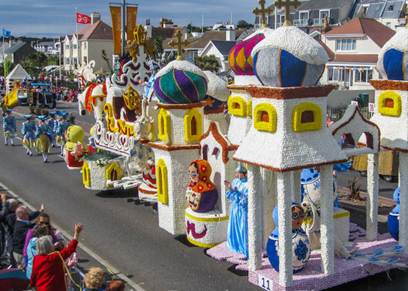 האי ג'רזי: קרבות הפרחים האי ג'רזי, המשתייך לשטחי החסות של הכתר הבריטי, נמצא בתעלת למאנש סמוך לחופי נורמנדי. היעדר מס ערך מוסף באי הופך אותו לגן עדן לקונים, בעיקר של מוצרי יוקרה, אבל מי שמגיע לכאן כדי לטייל ולאו דווקא כדי לקנות, יתרשם עד כמה ירוק האי הקטן. ובחודש אוגוסט, אל כל הירק הזה מצטרפים אינספור צבעים של פרחים באחד מפסטיבלי הפרחים הגדולים באירופה – קרבות הפרחים של ג'רזי (Jersey Battle of Flowers). מקורן של החגיגות ב-1902, במצעד פרחים שנועד לציין את הכתרתו של מלך בריטניה אדוארד השביעי, ומאז הן הלכו וגדלו. ההכנות לפסטיבל נערכות כמעט לאורך כל השנה, כשלא פחות מ-1.8 מיליון פרחים משמשים לעיטור 27 עגלות ובניית פסלי ענק שיעמדו עליהן. תהלוכת הפרחים בג'רזי. 1.8 מיליון פרחים משמשים לבניית 27 עגלות המתחרות ביניהן על תואר היפה ביותר