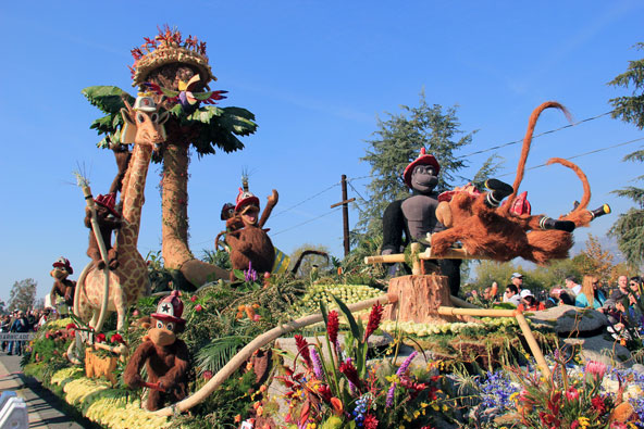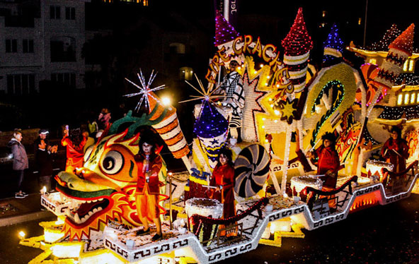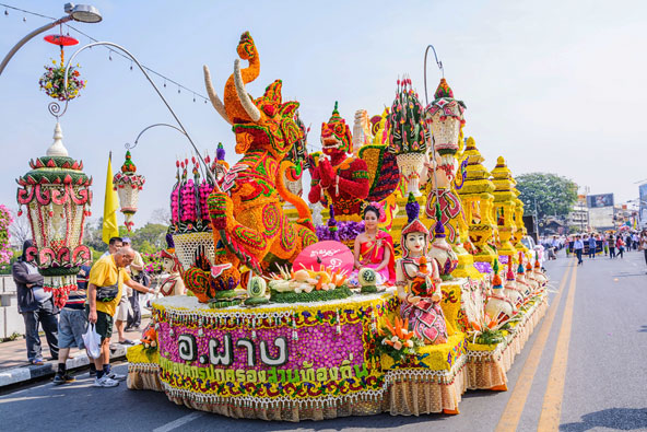 תאילנד: פסטיבל הפרחים בצ'יאנג מאי, תאילנד בפברואר, בזמן שאירופה רועדת מקור בעיצומו של החורף, בצ'יאנג מאי שבצפון תאילנד הפרחים נמצאים בשיא פריחתם. זה הזמן המושלם לפסטיבל פרחים שנתי, הכולל תצוגות של גנים מעוצבים, סידורי פרחים מיוחדים ועצים ושיחים הגזומים בשלל צורות. גולת הכותרת של הפסטיבל היא הלוכת פרחים, שמתקיימת ביומו השני, עם תצוגות ענקיות העשויות מפרחים שנישאות על גבי עגלות החולפות ברחובות העיר אל עבר פארק Suan Buak Haad. פסטיבל הפרחים של צ'יאנג מאי. העגלות מקושטות בדמויות מורכבות העשויות מפרחים | צילום: שאטרסטוק