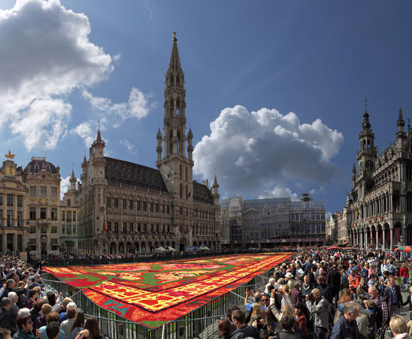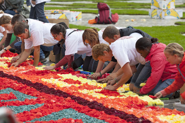 בלגיה: שטיח הפרחים של בריסל הגראן פלאס (Grand Place), הכיכר הגדולה של בריסל, היא אחת הכיכרות המרשימות באירופה וזאת בזכות הממדים העצומים שלה, בתי הגילדות המרשימים מהמאה ה-17 המקיפים אותה ובית העירייה המרהיב, מופת של אדריכלות גותית, החולש עליה. בכל חורף נערך כאן שוק חג המולד המסורתי ואחת לשנתיים, בחודש אוגוסט, הכיכר נבצעת באינספור צבעים כששטיח פרחים ענקי, באורך של 77 מ' ובשטח של 1,800 מ"ר נפרש עליה. העבודה על השטיח נמשכת זמן רב, שכן הוא עשוי ממיליון פרחים, המסודרים בשלל צורות גיאומטריות. במהלך שלושת הימים ששטיח הפרחים מכסה את הכיכר הגדולה, מגיעים המוני מבקרים מבלגיה וממדינות נוספות כדי לראות אותו. הכנת שטיח הפרחים בבריסל. מיליון פרחים מסודרים באופן שייצרו צורות גאומטריות מורכבות | צילום: שאטרסטוק