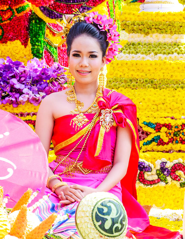 הבמות המעוטרות בפרחים נעות לאטן ברחובות, כשעליהן פסלי פרחים מרהיבים של מקדשים, ארמונות, דמויות מיתולוגיות ועוד – כולם עשויים מפרחים. על העגלות עומדים משתתפים בתלבושות מסורתיות של בני השבטים השונים של צפון תאילנד וכן צעירות יפהפיות, שמתחרות על תואר מלכת הפסטיבל, הנערכת בסופו של היום. במהלך הפסטיבל מתקיימות בעיר הופעות ופעילויות שונות הקשורות לפריחה ומוצבים בה דוכנים לממכר סידורי פרחים ועבודות יד מסורתיות. מתי? כל שנה במחצית הראשונה של חודש פברואר, התאריך המדויק משתנה משנה לשנה אחת המתמודדות על תואר מלכת פסטיבל הפרחים בצ'יאנג מאי | צילום: שאטרסטוק