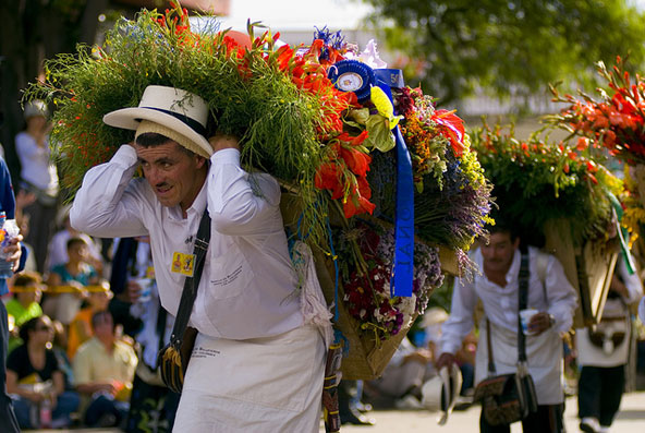 נשיאת הפרחים על הגב בפסטיבל הפרחים של מדיין היא זכר בהם סבלים נאלצו לסחוב סחורות בדרכים הרריות שאפילו בהמות מסע לא יכלו לחצות | צילום: Guía de Viajes Oficial de Medellín