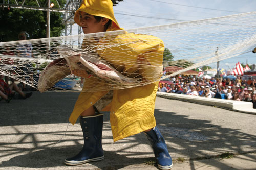 עשרים זוגות העיניים של הילדים שישבו על הבמה הגדולה לא ידעו במה להתמקד. מימינם חיכתה סירת משוטים כחולה, ולצדה עמד ארגז עץ סגור. מולם, על כיסאות מתקפלים, ישבו מאות צופים נלהבים כשגבם אל מפרץ מיין, ורק חיכו שהאקשן יתחיל. משמאלם – מת – התחמם בערסל הכוכב של האירוע: דג בקלה שמשקלו כ–12 קילוגרם. מנחת התחרות, אישה עם שיער צהוב ודיבור שופע אופטימיות אמריקאית, לא בזבזה זמן: "אנחנו עומדים לפתוח את אחד האירועים המרכזיים של פסטיבל הלובסטרים השנתי השישים של מדינת מיין". הילדים, בני שבע, שמונה ותשע, הקשיבו בריכוז. "החוקים פשוטים מאוד: ברגע שאתן את האות, תרוצו לארגז, תפתחו אותו, תוציאו את זוג המגפיים הכחולים ותנעלו אותם. אחר כך תלבשו את מעיל הדייגים הצהוב ותרכסו לפחות שניים מכפתוריו. אז תחבשו את כובע הדייגים כשהוא פונה לכיוון הנכון", אמרה והדגימה כיצד לחבוש את כובע הגומי הצהוב. "רק אחרי שתשימו עליכם את כל הציוד, תוכלו לרוץ לערסל, להרים את דג הבקלה, להיכנס לסירה ולהתיישב בה. ואז ייעצר השעון. הילד שיעשה את כל זה בזמן הקצר ביותר הוא המנצח". הילדים הסתכלו בדג הבקלה שעיניו חסרות ההבעה בהו בגגון שמעל הבמה. המבטים שלהם היו מוטרדים, אבל הם נראו מוכנים למשימה. הקהל הריע. תחרות סחיבת דג הבקלה השנתית לילדים יצאה לדרך.