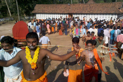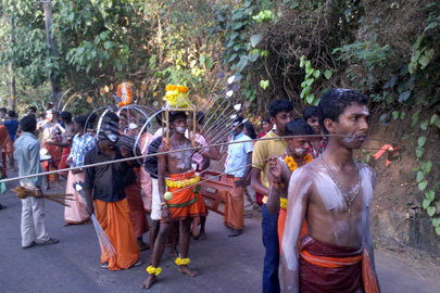 הטאמילים של דרום הודו חוגגים את הולדתו של אל המלחמה מורוגן בהבאת מנחות ובטקסים הכוללים ניקוב הלחיים בשיפודים, תקיעת מחטים בגוף והשחלת קרסים בעור. יואב בן-דב חזר מהודו עם סרטון מרתק (ולא קל לצפייה) שצילם בפסטיבל הניקוב פורסם 21.6.12 |