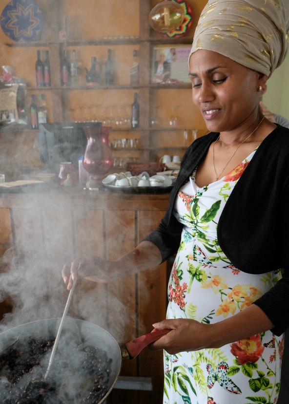לקינוח אפרת מגישה שלושה מיני פיצוחים קלויים ומסקרנים מגרעיני שעורה (גבס קולו), פופקורן מזרעי דורה (פנדשה) וגרגרי חומוס פריכים (שמברה). הגשת הקפה היא טקס חברתי בפני עצמו. אפרת קולה את פולי הקפה ירוקים במחבת ויוצאת אלינו כשהיא אפופה בעשן סמיך ומלא ניחוחות. את פולי הקפה הקלויים היא טוחנת ומגישה בספלים זעירים.