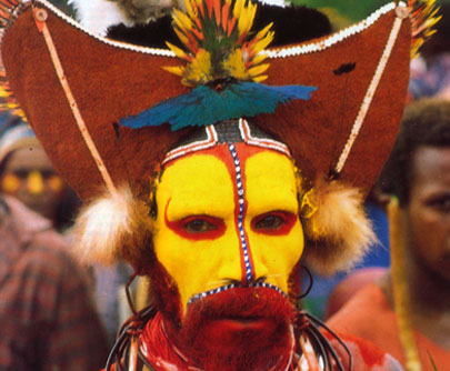 יום חג, סינג-סינג בארץ ההולי, וקבוצות הריקוד של שבט ההולי הן היפות והצבעוניות ביותר בכל הארץ. הסיבה לחגיגה היא חנוכת בית ספר חדש. רק גברים משתתפים בחגיגה, וכולם לבושים בבגד המסורתי, חובשים פיאות, פניהם צבועות באדום, בצהוב ובכחול, גופם מרוח בשמן. הם עומדים בשורה, כל אחד מהם מחזיק בידו את התוף המסורתי (KUNDU). שורת הרוקדים מקפצת מעלה מטה, חבריה צווחים מה שנשמע לי כ"וואא הווהוו" ומכים בחוזקה בתוף. חלק מן המשתתפים, ודווקא הם משכו את תשומת לבי יותר מכל האחרים, הגיעו לחגיגות הסינג-סינג לבושים במערכות לבוש מוזרות: שילוב של הבגד הפפואני המסורתי ובגדים מערביים. הם הפגינו הרבה דמיון בהרכבת מערכות הלבוש האלה, וניכר בהם שאינם כבולים למוסכמות או למסורת חד-משמעית.