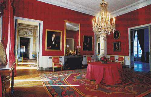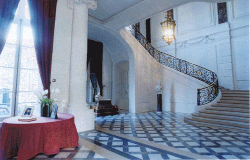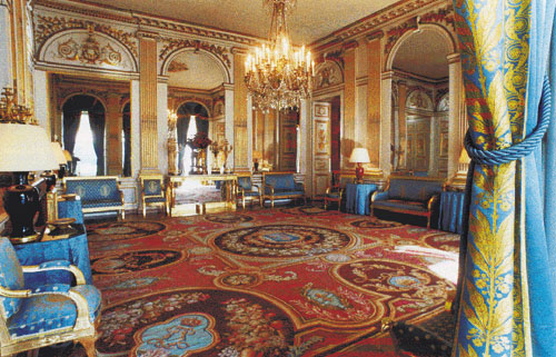 גרם מדרגות מפואר מברזל מעוטר פיתוחים מוביל לקומה הפרטית, שבה לא הורשינו לבקר. מולו נמצאת דלת המובילה לחדר ובו ספריית עץ בסגנון לואי ה־14. החדר הקרוי "הסלון הקטן" מעביר אותנו לסגנון לואי ה־16: אח עשוי שיש לבן ותבליטים מעוטרים מעל לדלתות. את חדר האוכל הגדול מקשטים שטיחי קיר מהמאה ה־18, וב"סלון הגדול" תלויים שטיחי קיר עתיקים יותר, מהמאה ה־16, ובהם סצנות ציד מלכותיות. אפילו התאונה המצערת, שבה שבר אחד המבקרים אגרטל סיני עתיק ורב ערך, לא גרמה לעובדי השגרירות האדיבים לאבד את שלוות רוחם. פרט לכמה אנחות מהוסות, הם הקפידו לשמור על אלגנטיות דיפלומטית ראויה לציון.