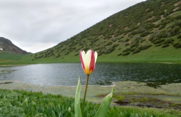 צבעוני פורח על שפת אגם בהרי טיאן שאן