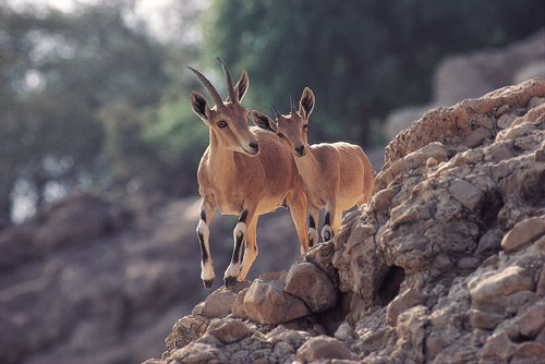 | יעלה וגדי בעין גדי. התמונה צולמה בעדשת 400 מילימטר, ובסרט שקופיות קודאכרום 64 אסא ובמפתח צמצם 3.5 |