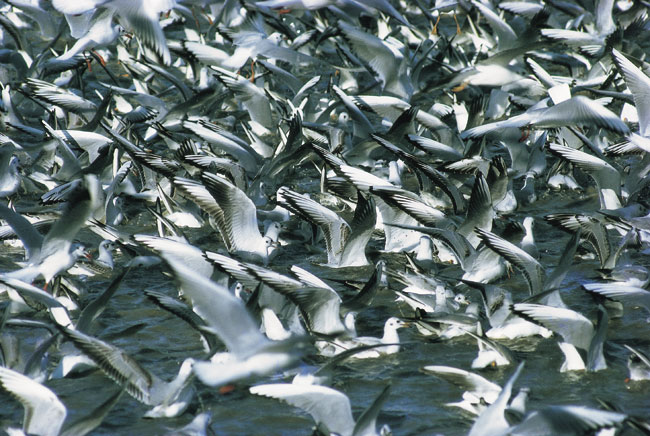 להקות של שחפי אגמים מלקטות דגיגים במעגן מיכאל