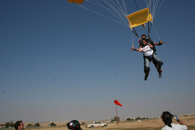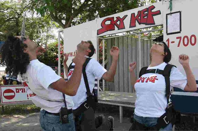 שבכל המראה. אבל מצד שני, מסתבר שגם נחיתות אני די אוהב. ההתרגשות בה התנדבתי לבקר באתר "סקיי כיף" שבשדה תימן ולחוות את ריגושיו הלכה מדי יום התחלפה בשאלה מטרידה: האם אני שפוי? לשם בירור מעמיק יותר של העניין יצאתי לבילוי לילי עם צנחן בעל ותק מסוים. ידידי עמית זכה לחוות צניחה חופשית פעם אחת מעל חוף הבונים שליד עתלית. "זה ה-'היי' המוחלט", סיפר לי מעל בירה ארצית לגמרי בפאב תל אביבי מקורקע. "זה סוף הדרך". "מזה בדיוק אני חושש", ציינתי. "עזוב שטויות. זה נכון, אמנם, שמצב של נפילה הוא מצב שבו השרירים שלך מתכווצים ובאופן טבעי אתה לא נושם. כך שמיד אחרי הקפיצה אתה צריך להכריח את עצמך לנשום, אבל אתה תתגבר על זה, אני בטוח". אלי שבשמים, לא חשבתי שאפילו הנשימה תהווה בעיה. אין לי מספיק ממה לדאוג? בבוקר היום הגדול אני מאמן את ריאותי כמו אשה בראשית החודש התשיעי להריונה ואז יוצא לדרום בלוויית סימי, מעורכות מסע אחר. בפני סימי עומדת משימה משולשת: 1. לקפוץ ממטוס. 2. לזכור לנשום. 3. לקרוא בדרך למטה כתבה מתוך אחד הגיליונות האחרונים של "מסע אחר", ולהוכיח בכך שאין מקום שלא ראוי להביא אליו חומר קריאה טוב. אני אישית קצת מתחרט על כך שלא הבאתי אתי ספר תהילים כחומר קריאה טוב, אבל יש מי שדאג לחרטות שכאלה. בכניסה לאתר אנו פוגשים ביוסף חסדן, בחור ישיבה חב"דניק צעיר וחינני, המציע לבאי המקום הנחת תפילין על חשבון המלך המשיח. רק שלא ידוגו את המדריך מאחורי כובעו השחור של חסדן מתהלכים צעירים וצעירות במלבושים צבעוניים, שרצועות ספוג מזדקרות מתוכם. מסתבר שאלה הן רצועות "גריפ". הן מאפשרות אחיזה של הצונחים אלה באלה בזמן הקפיצה לשם ביצוע פעלולים מיוחדים. הגענו אל קינם של מורעלי הצניחה החופשית. מכאן מובילה הדרך רק למעלה. יש אולי דבר אחד מפחיד יותר מהצניחה עצמה, והוא החתימה על טופס הוויתור על הזכויות המשפטיות, אשר מוגש לאלו שזו להם פעם ראשונה שהם קופצים ממטוס. נוסח הטופס מקובל בפינות רבות של העולם – הוא נועד להגן על בעלי העסק, אבל גם להזכיר לצונחים שבאו מרצונם ושהם עומדים להתנסות בחוויה שיש עמה סיכון מה. המלה "מוות", למשל, מופיעה פעמיים באותיות מודגשות על העמוד הראשון. בעלי סקיי כיף, רוי ריטר ואורן בן-יאיר, אינם מרגיעים אותנו. תפקידם הפוך: להבהיל את הצנחן הפוטנציאלי עד כדי כך, שאם אינו מסור לחלוטין להחלטתו לצנוח, ייסוג ממנה. עלינו זה עובד. אנחנו לוקחים זמן להתלבט ומתהלכים בינתיים ברחבה שליד הסככה הגדולה, מתחתיה מקופלים המצנחים. "היתה לך פעם חוויה לא נעימה בספורט אתגרי?" אני שואל את סימי. "כשלמדתי צלילה, דגו לי את המדריך באמצע צלילת ההיכרות". "מה? מה זאת אומרת דגו?" "מישהו השליך חכה והוא נתפס בה. פתאום אני רואה שהוא נעלם לי. למזלי הייתי קרובה יחסית לפני המים, הרמתי ראש מעליהם ואני רואה אותו שוחה שם, מוציא משהו מהיד ומקלל". לא נעים, אבל מן הסיפור הזה אפשר גם לשאוב עידוד. בשמים הפתוחים אף אחד לא ידוג לנו את המדריכים. בסופו של דבר, הם יהיו צמודים אלינו ברתמות. אלה הצונחים לראשונה משתמשים במצנחי "טאנדם" המיועדים לשניים. כאורחים נינשא למעשה כמטען על ידי מדריכינו. תפקידנו היחיד יהיה "לעשות בננה", כלומר לקפל את הרגליים עם הזינוק ולהישמע להוראות שיבואו מאחור. אפילו לא מוטל עלינו לגעת ראשונים בקרקע עם הנחיתה. רגלי המדריך הן שיפגישו אותנו שוב עם הארץ. אפשר לעשות את זה.