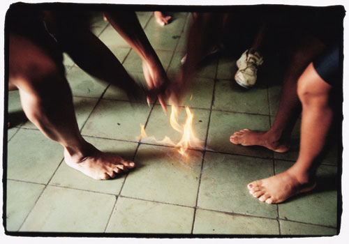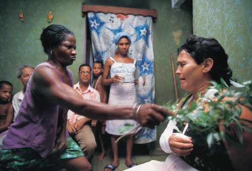 האשה משמאל אינה כוהנת סנטרייה, אבל במהלך הטקס היא נכנסה פתאום למרכז המעגל, טיהרה אותי ואת המצלמה שלי מרוחות באמצעות אגד של ענפים, ואז התנפלה בריקוד סוער על האישה שמימין, כדי לרפא אותה. הטקס נמשך יותר משעתיים, בחדר מסריח ובחום נורא. כדי להתאושש יצאתי למרפסת, שממנה נשקף נוף רוגע של האוקיינוס האטלנטי |