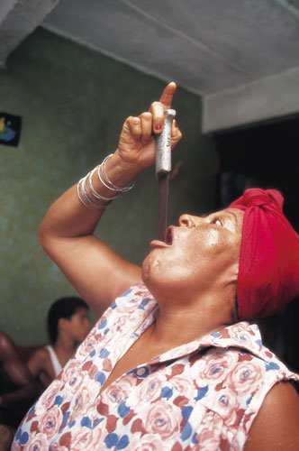 | סניידה לגמה עוד ועוד רום, בלעב עלים מהמזבח, דקרה את אצבעה במחט ומצצה את דמה, רקדה עם שתי חרבות, דקרה את עצמה והחדירה חרב לפיה. "הווּדוּ הוא כמו נשק או חרב נגד אויבים, ואילו הסנטרייה היא כמו מלאך ששומר ומגן על אנשים מרע ועוזר להם", אמר הסנטרו טוני גיולרטה |