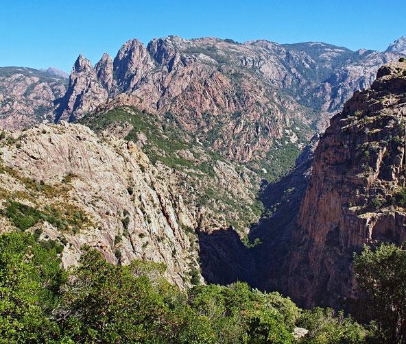 במרכז האי נמצאת קורטה (Corte), עיר קטנה שהיתה למשך זמן קצר בירתה של קורסיקה החופשית, תחת הנהגתו של פסקל פאולי. אפשר לשוטט ברחובות הציוריים ברגל או ברכבת זעירה. מעל קורטה מתנוססת מצודה, סיטדל, מרשימה, וסביבה יש הרים גבוהים. זוהי נקודת יציאה אל הטבע הפראי וההררי של מרכז האי ואל הקניונים העצומים. אחד הקניונים האלה, קניון ספלונקה (Spelunca), הוא בין המרשימים באי. צוקי גרניט מתנשאים לגובה של 1,000 מ' ובנקיקיו גדלים אורנים עתיקים גדולי ממדים. דרכים עתיקות, ששימשו את הרועים (וגם את השודדים), עוברות בקניון ובסביבתו ולאורכו פזורים מעיינות.