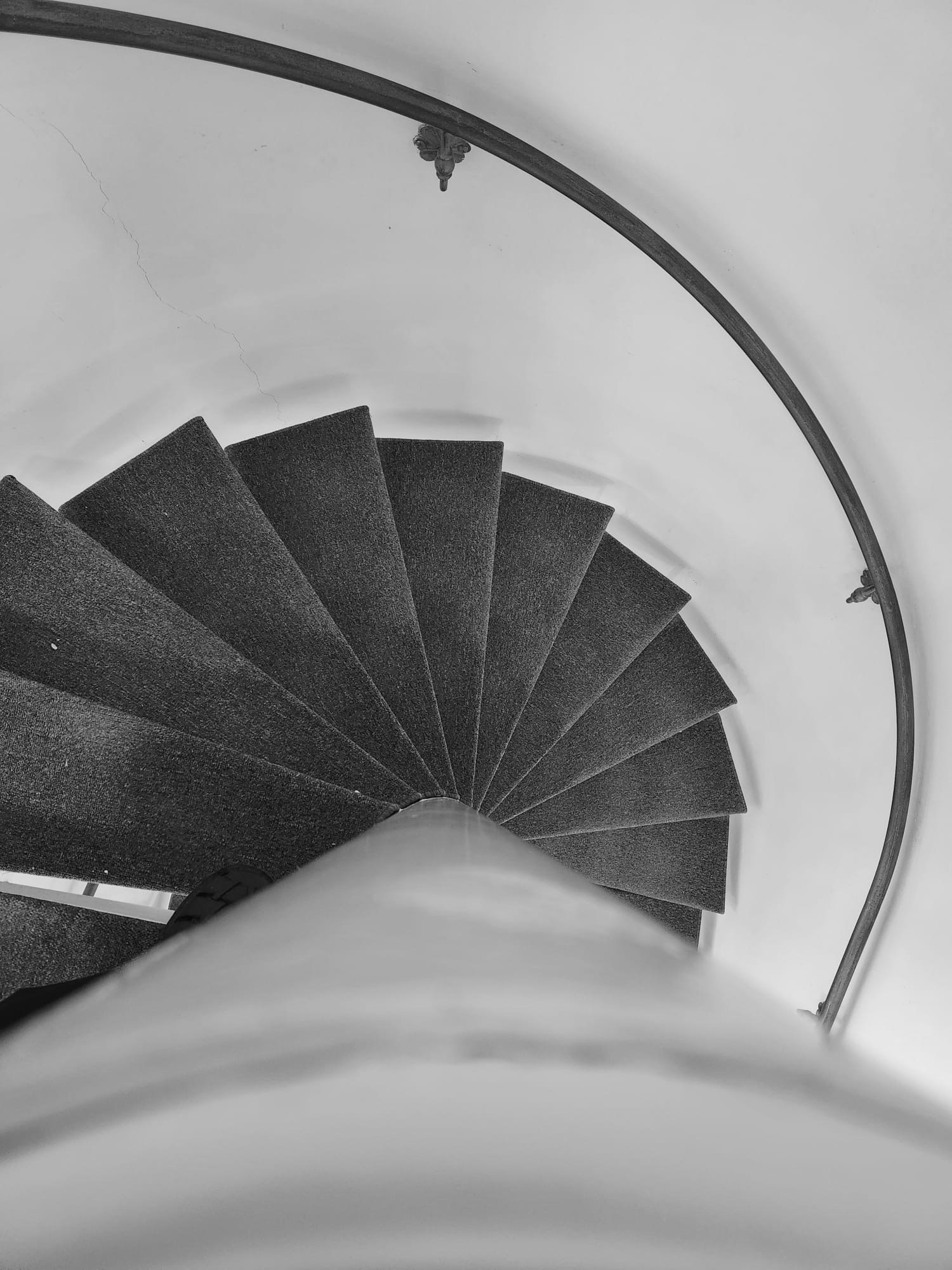 יצחק נויסיוביץ יצר צילום אבסטרקטי נקי, שבו מדרגות מתפתלות מובילות את המבט מטה. עמוד מטושטש יוצר צורת משולש, התורמת לעומק ולכיוון התנועה בתוך הפריים.