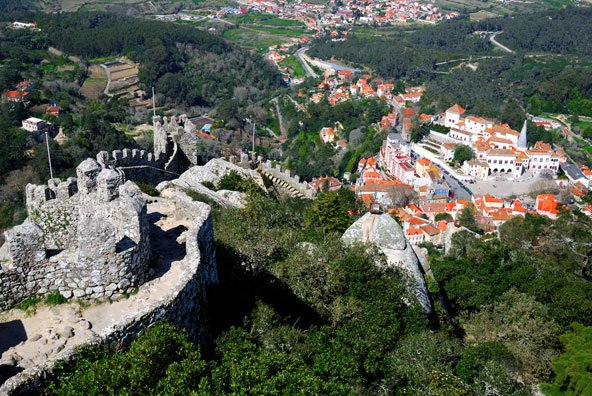 קסטלו דה מורוס, סינטרה, פורטוגל רק לגלגל את השם פורטוגל על השפתיים, עושה חשק למזוג כוסית של יין פורט ולהתענג על צלילי מוזיקת פאדו (מוזיקה פורטוגלית עממית) נוגה ומעוררת געגועים. טיול במדינה המקסימה מציע נופים עירוניים רומנטיים המשלבים ישן עם חדש, כמו בליסבון הבירה המאלפת, לצד נופי טבע בראשיתי של גבעות ירוקות מנוקדות בכפרים וארמונות עתיקים, חופים נהדרים וים כחול. בסינטרה (Sintra), עיירה יפהפייה השוכנת על הדרך בין ליסבון לפורטו, נמצא ארמון פנה המרשים שידוע כסמלה של העיר ואחד המקומות היפים בפורטוגל. אבל נקודת התצפית הכי מרהיבה באזור, ויש אומרים בפורטוגל כולה, נמצאת במצודה המורית (Castelo dos Mouros), מצודה עתיקה ושמורה שלרגליה נפרש נוף ציורי להפליא של העיירה וסביבותיה.  בתי העיירה סינטרה והטבע הירוק מסביב במבט מראש המצודה המורית