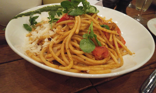 איפה אוכלים? את הארוחה שלנו פתחנו בסלט ירוק מרענן, סלט קפרזה, צלחת אנטיפסטי שהתרוקנה במהירות מפתיעה, ומנה של קישואים עם גבינת צאן קלויה. את המנות הראשונות ליוותה פוקצ'ה חמימה שנבצעה בידיים ונטבלה שוב ושוב בקערת שמן הזית והבלסמי. ידענו שאסור לנו לאכול את כל הפוקצ'ה, אבל לא הצלחנו להתאפק.