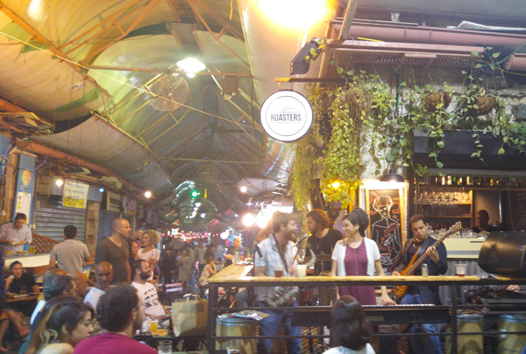 יום שלישי, תשע וחצי בערב. אנחנו הולכים במורד רחוב יפו, פונים שמאלה ונכנסים לשוק מחנה יהודה. אם חשבתם שאחרי שהסוחרים סוגרים את הבאסטות והקונים הלכו הביתה השוק עזוב ושומם – אין טעות גדולה מזאת. רחוב עץ חיים, בלב שוק מחנה יהודה, מואר ומלא חיים ושמחה כאילו אנחנו בעיצומה של חגיגה מיוחדת, אבל לא: זהו סתם יום של חול באמצע הקיץ הירושלמי. המוני אדם גודשים את השולחנות הקטנים לאורך סמטאות השוק, מוזיקה עליזה מתנגנת והאורות בוהקים. בקפה Rosters, בין דוכן חלווה לדוכן פיצוחים, סקסופוניסט, קלידנית, גיטריסט ומתופף מנגנים מקצבים לטיניים סוחפים. כמה זוגות רוקדים סמבה באמצע הרחוב, יושבי הקפה לא מפסיקים לזוז לקצב המוזיקה, מניעים מצד לצד את כוס הבירה שלהם – בירה שפירא, אלא מה. אנחנו בירושלים, אחרי הכל.