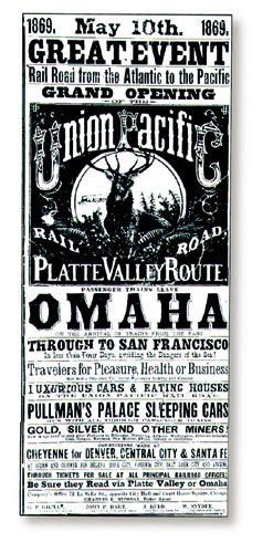 גבוהה, רחבה ויפה קליפורניה היא המדינה השלישית בגודלה בארצות הברית (לאחר אלסקה וטקסס), אך עושרה הטבעי המופלג ומזג האוויר הממוזג שלה הפכו אותה למדינה המאוכלסת ביותר בארצות הברית. בשל הריה הגבוהים מכוסי שלג העד, אורכה האדיר (יותר מ־1,600 קילומטר) ועושרה הטבעי, היא כונתה "Handsome High, Wide and". והיא אכן גבוהה, רחבה ויפה – יופי הנובע מההוד הטבעי ומההצלחה הכלכלית הקשורה בהיסטוריה שלה. הבסיס להצלחה ולעושר הרב היה גילוי המחצבים היקרים כזהב, כסף ומתכות יקרות  | כרזה המודיעה על פתיחת קו הרכבת בין החוף המזרחי של ארצות הברית לחופה המערבי ב-10 במאי 1869 |