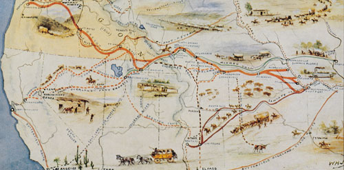 שתייה, הימורים וחיבה לנשים מיד עם הגעתם לקליפורניה, החלו המהגרים בחיפוש הזהב. שיטות הכרייה היו כמו של המגלים הראשונים, וגם הופעתם של כלים מתוחכמים יותר הקלה אך במעט על המלאכה הקשה, שדרשה שינוע עפר בכמויות עצומות, תוך עמידה במים קפואים בעוד השמש קופחת ממעל ללא רחם. ההתלהבות, שנבעה מהציפייה ומהתקווה למצוא את העושר המיוחל, הביאה אנשים לעבוד עד תשישות כוחות, כשהם מזניחים צרכים בסיסיים כמו אכילה ושינה. שנתיים לאחר גילוי הזהב הראשון, התגמול למאמצים היה בלתי מספק לרוב: ה"פאונד  | | נתיבי המסע מערבה. בשנת 1949, מדרום מערב לסולט לייק סיטי שביוטה, ניסתה שיירת עגלות לא להיתקע תחת שלגי החורף. הם התפצלו: כמה בחרו נתיב אחר, אבל אחרים תעו בדרכם והגיעו לאיזור מדברי בשם "עמק המוות". תריסר אנשים קיפחו שם את חייהם. סיפורם של אנשי השיירה הפך למיתולוגיה | באדיבות ספריית הקונגרס |
