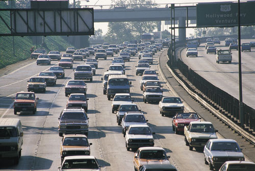 המכונית החשמלית כיום יש בקליפורניה יותר מ־3,000 כלי רכב המוּנעים בחשמל בלבד. ברחבי המ־דינה פרושות כ־350 תח־נות טעינה. הטעינה אמנם נמשכת שעות אחדות, אך היא מסופקת  | | כביש בלוס אנג'לס. 85 אחוז מהקרקע בעיר מוקדשים לכלי רכב, שזיהום האוויר שהם יוצרים גורם למחלות לב וריאה | צילום: משה שי |