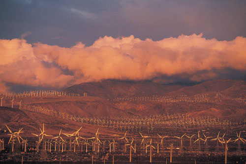 בכוח הרוח טורבינות רוח מתבססות על עקרונות דומים לטחנות הרוח בהולנד, אך במקום להשתמש ברוח לטחינת קמח, מנוצלת האנרגיה שלה להפקת חשמל. היתרונות של טורבינת הרוח הם בניצול משאב בלתי מתכלה – רוח, ובהעדר פסולת בתהליך ייצור האנרגיה. החסרונות הם בכך שהרוח היא במידה רבה בלתי צפויה, ושהמקומות המתאימים להפקת האנרגייה רחוקים מאזורי הצריכה, מה שהופך את עלות השינוע שלה לגבוהה. תחום הפקת חשמל באמצעות אנרגיית רוח תפס תאוצה עם החיפושים אחר אנרגיה חלופית בשנות השבעים של המאה ה־20, בעת משבר הנפט שפקד את ארצות הברית ואת המערב כולו. בחיפושיה של ממשלת ארצות הברית אחר מקורות אנרגיה חלופיים בלטה קליפורניה, שנמצאה מתאימה מבחינת האקלים להוביל את הפיתוח והיישום בתחום אנרגיית הרוח, כמו גם בתחום האנרגיה הסולרית. במהלך שנות השמונים הוקמו בקליפורניה יותר מ־15 אלף טורבינות רוח, שסיפקו אנרגיה חשמלית נקייה וזולה. בסך הכל סיפקו הטורבינות, במהלך שנות השמונים, יותר מ־1,500 מגה ואט, שהם בממוצע כאחוז אחד מצריכת החשמל של המדינה כולה. הפיתוח המואץ של מקורות אנרגיה חלופיים נמשך עד 1985, נחלש בשנים שלאחר מכן והתחזק שוב באמצע שנות התשעים כתוצאה ממדיניות ממשל קלינטון ומשיפורים טכנולוגיים בתחום. כיום מחליפים את הטורבינות הישנות בדגמים חדישים, המייצרים יותר חשמל ומצריכים פחות אחזקה. התהליך נועד לנצל תשתיות ישנות בכל רחבי ארצות הברית ונתמך על ידי הממשל. כיום ניצבות בקליפורניה 16 אלף טורבינות, המפיקות 1,700 מגה ואט בקירוב. הן מייצרות יותר משלושה מיליארד קילוואט שעה של חשמל בשנה, יכולת המשתווה לזו של תחנת כוח גרעינית בינונית.