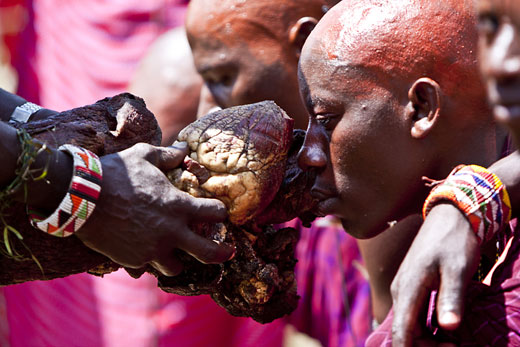 הרגשתי צורך להשתלב, אבל איך? בתחילה עמדתי והם חלפו על פני, עד שלרגע מצאתי את עצמי בתוך המעגלים שנוצרו. הרגשתי שהם מקבלים אותי ומשם המשכתי להשתחרר, לזרום איתם בקצב שלהם, מבלי להפריע. כאשר מאות הצעירים נכנסו בהדרגה למתחם המקודש, שהיה מגודר בענפים שנחתכו וסודרו כמעגל בעל כניסה אחת. נכנסתי איתם וקיוויתי שלא יזרקו אותי. בתוך המתחם היה מבנה גדול מעץ ועליו נתחי בשר פרה מונחים על עלים ומתחתם מדורה – מעין מנגל ענקי. לא רחוק ממנו, מעגל באדמה ובו פיסות עור פרה טובלות בשתן. בהמשך הבנתי שכיוון שאני לבן (מוזונגו), שאינו שייך, מותר לי להיכנס, בעוד שהנהג הקנייתי שלנו, בן שבט הקיקויו, הוצא אחר כבוד מהמתחם. צילמתי בחופשיות את הכניסה המסודרת של קבוצות הצעירים למתחם, כל פעם קבוצה אחרת, שלוותה בקריאות קרב, צרחות ותקיעה בשופרות. לאחר שתי הקפות במתחם, הם התיישבו בכמה שורות והטקס עצמו החל.
