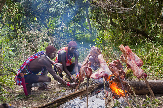 כשיצאנו לנוח מעט מההמולה, לא יכולנו שלא להריח את הבשר על המנגל ולראות את העשן שהיתמר מתוך החורש. צעדנו לשם, מלווים בנהג ובמארח. תחת כל עץ רענן יושבים גברים, מדברים ושותים בירה. בין העצים קבוצה של צעירים שיפדה על מקלות עץ נתחים גדולים של פרה, ואת העור מתחו עם יתדות על הדשא. רק הצעירים מטפלים בבשר, לנשים אסור להתקרב, וניכר בהם שהם משולהבים.
