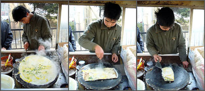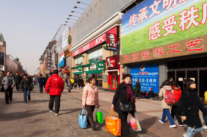 השוק היחיד בבייג'ינג שנותר במתכונת של דוכנים פתוחים הוא שוק המזון המוכן של רחוב וואנג פו ג'ין (Wang Fu Jin). השוק נפתח כל ערב ב-18:45 ונסגר ב-22:00. את הדוכנים סוגרים ומחברים לאופניים. שיירת אופניים נוסעת אז ברחובות העיר, אל מגרש חנייה, שם מאופסנים כל הדוכנים הארוזים עד ליום הבא. במשך היום אין כל רמז לכך שהמקום הופך לשוק צבעוני ותוסס לעת ערב. בין הדוכנים אפשר לטעום אטריות, שיפודי כבש, פירות מסוכרים, תמנונים, דיונונים, חסילונים, ואפילו עקרבים, חגבים, זחלי משי, מרבי רגליים, ושאר ירקות. מאחר ואין מקום עליו פוסחים במסגרת שיפור פני העיר, את הריצוף שעל הכביש החליפו לפני כמה שנים לאבן מבהיקה ויפה, והאזור תחום בגדרות ביטחון ששפע פחי אשפה פזורים לאורכם. לצד הסינים והתיירים שבאים לטעום ממגוון המטעמים, אפשר לראות גם זקנה ששולה מן הפח שיפוד עליו נותר מעט בשר, ילדים שמחפשים פחיות למחזור, וכמה קבצנים שלא מרפים. כל אלה באים להזכיר לנו שמאחורי החזית הנוצצת של הקידמה, רבים נותרים מאחור. לאורכו של רחוב וואנג פו ג'ין שהוא רחוב הזהב של בייג'ינג נמצאים כמה מרכזי קניות חשובים. שין דונג אן (Sun Dong An) הוא מרכז קניות מרשים שמשתלט על פלח נכבד מן הרחוב ועל המפגש שבין וואנג פו ג'ין עם שדרת צ'אנג אן (Chang An), המובילה אל כיכר טיאן אן מן (Tian An Men), מרכז קניות לעילית של בייג'ינג בשם אוריינטל פלזה (Oriental Plaza). במרכז אוסף של מעצבים בעלי שם עולמי, ורמת המבנה עצמו גבוהה ביותר. לצד מותגים כמו ברברי, קנזו וג'יבנשי אפשר לשבת לקפה בסטארבקס, ולגלידה בהאגן דאז. באורינטל פלאזה להבדיל מן השווקים, הסחורה אמיתית.
