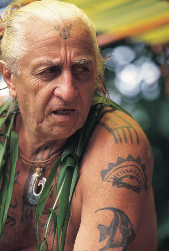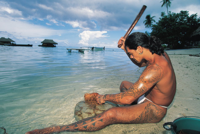 הכלבים נבחו עת ארוכה עד שטוואנה סלמון, לבוש בפריאו (Pareu) צבעוני – הבגד הפולינזי המסורתי – ומקושט בחגורות עלים, ירד במדרגות הבקתה לקבל את פנינו. הבקתה שלמרגלות המצוקים הכהים של האי היתה מוקפת גן רחב ידיים של דקלי קוקוס. רוח הערב הביאה עימה ריחות של פרחי היביסקוס, לימונית־בר ווניל. הצללים התעבו, דהו והפכו ללילה טרופי כחול, מעוטר בכוכבים הבהירים של הים הדרומי. הנופים האלה, שתוארו בספריו של הסופר האנגלי לואיס סטיבנסון ובציורים של הצייר הצרפתי פול גוגן, הוציאו מוניטין ל"איי גן העדן" ומשכו לאיזור נוסעים והרפתקנים. לכן, כמו רבים מתושבי האי טהיטי (Tahiti) שבפולינזיה הצרפתית (French Polynesia), זורם בעורקיו של סלמון דם מעורב. הוא נושא שם משפחה שקיבל מאחד מאבותיו, שהיה יהודי. אביו היה נורווגי. אבל הצ'יף הקשיש מקפיד על גינוני מלכות, כי מצד אימו הטהיטית הוא נצר למשפחת המלוכה של האי. "לפניהם עמד גבר, שעורו הבהיק כנחושת קלל. למותניו חגר כפות דקלים, וכל גופו היה מכוסה בכתובת קעקע", מתאר אריך קסטנר את הצ'יף הפולינזי בספרו "שלושים וחמישה במאי". הספר, שנכתב בשנות השלושים כסיפור ילדים, היה למעשה סאטירה מושחזת היטב על הדימויים האקזוטיים של האדם הלבן. בעת שנכתבו שורות אלה ידעו כולם כי אמנות הקעקועים של הילידים באיי הדרום נשכחה ואבדה. בעשור האחרון, במסגרת החיפוש אחר שורשיהם, חוללו סלמון ועמיתיו, האמנים המקעקעים ששמרו על מיומנותם בסתר, תחייה של המסורת העתיקה. בזכותם, שוב מקשטים כיום הסמלים המסורתיים, הכתובים בעור, פולינזים רבים, מחופי הזהב של הוואי ועד לקרחוני ניו־זילנד.