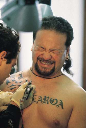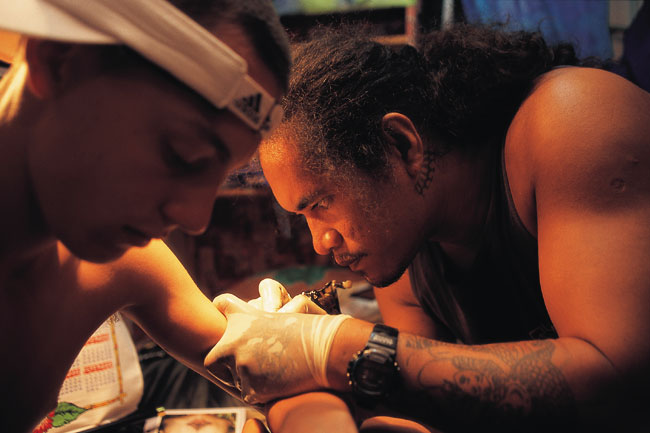 אל ארץ הענן הלבן מטהיטי שבאיי החברה טסנו דרומה ומערבה לררוטונגה (Rarotonga) שבאיי קוק (Cook Islands), בדרכנו לניו־זילנד. שעות ארוכות של טיסה, לאורך מסלול שבו, קרוב לוודאי, שטו לפני אלף שנה ספינות הקאנו של אבותיהם של המאורים. עם גילוי אוטרואה (Aotearoa), ארץ הענן הלבן הארוך – שמה המקורי של ניו־זילנד – הסתיימה ההגירה הפולינזית ונקבעו הגבולות הגיאוגרפיים והתרבותיים של עולמם. הגענו לסופו של נתיב הקעקועים. ד"ר רוג'ר ניש, אנתרופולוג ומומחה לאמנות מאורית, אוצר לאתנוגרפיה במוזיאון אוקלנד, פתח את הדלתות המגינות על המחסנים השמורים ביותר במוסד. למוד ניסיון, המתין ניש לאנחת ההתפעלות. יער של עמודי עץ עצומים,  | | איניה טיילור מניו-זילנד, בעל הסטודיו היחיד בעולם לקעקועים מאוריים, בעבודה. הוא לעולם לא יקעקע מישהו שהוא לא מחבב. וכן, זה כואב |