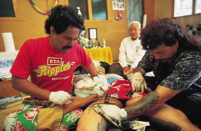 בדירה של בית מגורים בשדרות פומארה, בין מסעדות היוקרה של הטיילת. מוסיקה מחרישת אוזניים ופסלי טיקי עשויים גבס מקבלים את פני הלקוחות והמבקרים. הרבה חברים יש להם, לאחים סלמון, הבאים ויוצאים מהסטודיו, מעדכנים אותם בחדשות האחרונות ומדברים על סירות ומוסיקה. אמני הקעקועים הצעירים והאופנתיים הם גם שייטי קאנו וחברים בלהקת רוק. "החיים טובים", קובע מאנו, האח הצעיר, "העבודה נפלאה והלקוחות תמיד מרוצים". הם מקעקעים זה את זה מאז שהיו ילדים. אמם, גם היא בת למשפחת המלוכה בטהיטי, נישאה לאביהם המאורי ונסעה אחריו לניו־זילנד. בגיל עשר שבו האחים לפאפיטה. הם מרגישים קרובים יותר למשפחת אמם ומעדיפים את דגמי הקעקועים המקומיים. אחת מזרועותיו של מאנו מכוסה אמנם בדגמים מאוריים, מחווה למורשתו של אביו, אבל שאר חלקי גופו, מכף רגל ועד צוואר, מעוטרים בדגמי קעקועים בנוסח טהיטי. הוא מפשיל את חולצתו ומסביר: "הדגמים הגיאומטריים, משולשים, רצועות ונקודות, הם סמלי המשפחה. הטיקי המשפחתיים והאישיים נועדו להגנה. הכרישים מעניקים כוח ומשפרים את הזיכרון, הצבים מבטיחים פוריות והלטאות – אלמוות". ארומה, הבכור, מסרב בתחילה להוריד את חולצתו. הוא חושש שפרסום הצילום יאפשר למקעקעים אחרים להעתיק את הדגמים. חשש מגנבה אמנותית ומהעתקת הקמיעות האישיים הטריד גם אמנים אחרים שפגשנו. בניגוד לדור המייסדים, הדוד טוואנה סלמון ועמיתיו, מקעקעים היורשים גם דגמים מערביים. זה בצד זה תלויים על הקיר דגמי נשרים וגולגלות בצבעים עזים וסמלים מסורתיים בשחור־לבן. "בטהיטי חיים בני לאומים רבים", אומר ארומה, "וחלק מהלקוחות שלנו הם חיילים ומלחים זרים". מאקיקו קוואהארה, אנתרופולוגית מיפאן שפגשנו בסטודיו, מתמקדת בהיבטים התרבותיים של אמנות הקעקועים המודרנית בפולינזיה. במחקרה החלוצי קובעת קוואהארה שיטת מיון לסמלים השכיחים ומחלקת אותם לשלושה סוגים: דגם מסורתי, ניאו־מסורתי וסגנון MTV. יש גם דגמים מעורבים. למשל, הלקוחה שארומה קעקע במהלך הביקור שלנו, פולינזית מתולתלת ועליזה העובדת כמזכירה בסוכנות נסיעות, ביקשה שני סנפירי כריש מסורתיים ופרח צבעוני במרכז. אמן הקעקועים, ידיו מכוסות בכפפות פלסטיק דקות, רכן על החלק התחתון של גבה, ושבילי דם דקים התערבבו בצבע שמתחת למחט החשמלית. "זה הקעקוע הראשון שלי", אמרה. "וכן, זה כואב".