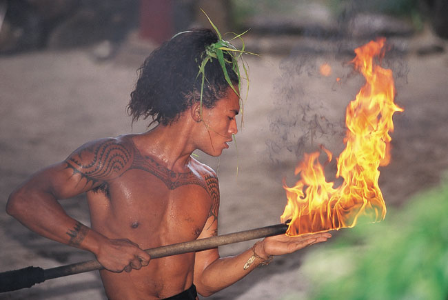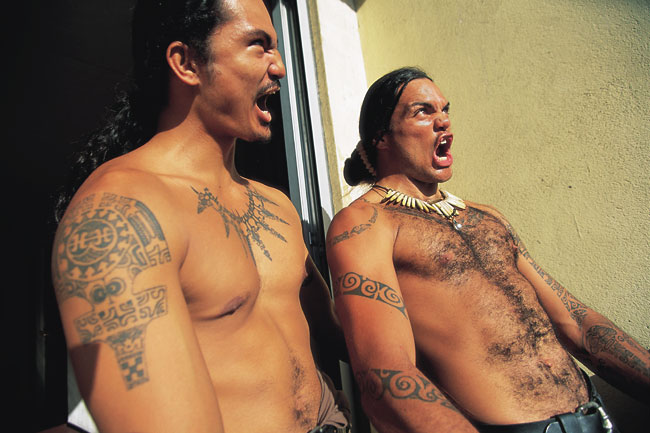 מגולפים ושמורים להפליא, שגובהם כחמישה מטרים, התגלה מבעד לדלתות המתכת הכבדות. מנגד הביטו בנו האבות הקדומים, המגולפים על עמודי הענק של בתי המפגש של השבטים השונים, ופניהם מעוטרות במוקו, קעקועי הפנים המסורתיים. דגמי קעקועים כיסו גם את פניהם ואת רגליהם של פסלי העץ הקטנים יותר שגדשו את המחסן. "זה לא אוסף אמנות. הפסלים האלה הם ייצוגים של אבותיהם של אנשים חיים. אני סבור כי דגמי הקעקועים שגולפו על הפסלים הם סמליים. אבל יש חוקרים הסבורים שמקריאת הסמלים אפשר ללמוד פרטים על הקשרים המשפחתיים ועל מעמדם החברתי של האבות הקדומים", הסביר בדרכנו אל פסל האב הקדמון המפורסם מבית המפגש ברוטורואה (Rotorua). התיאוריה הזו חוללה באחרונה שערורייה, הנוגעת לדמות הזו, שעיני אבן הירקן שלה השקיפו עלינו באדנות. על פי קריאת הסמלים, הגיעו החוקרים למסקנה שהאב הקדום היה בנו הלא־חוקי של מנהיג השבט. "בגלל הדעות הקדומות שלנו", אמר ניש, "הפרשנות העליבה מאוד את המאורים". בשנת 1840 חתמו המושל הבריטי של ניו־זילנד ומנהיגי המאורים על אמנת ווייטנגי (Waitangi), שהסדירה את הזכויות הטריטוריאליות ואת מעמדם של הילידים, אך ההסכמים הופרו לעיתים קרובות. במהלך שנות השישים של המאה ה־19 פרצו מלחמות בין המתיישבים החדשים לבין המאורים, מספר הילידים ירד בהדרגה ונלקחו מהם שטחי המחיה המסורתיים שלהם. "ייתכן שהלוחמים המאורים האחרונים המקושטים בקעקועים נעלמו עם תום הקרבות. אבל יש עדויות על כך שהמשיכו לקעקע נשים עד ראשית המאה ה־20", אמר ניש. לכן, ניו־זילנד היא אחד המקומות היחידים בעולם התרבויות הפולינזי שבהם נשמרה אמנות הקעקועים. המאורים מתייחסים אליה כאמנות מקודשת ושומרים על הסוד של הסמלים. במשך שנים רבות היה האוסף של מוזיאון אוקלנד בית הספר היחיד לאמנות הקעקועים שהכירו החוקרים. כיום, במסגרת תחיית התרבות המאורית, יש אפשרויות נוספות, למשל "המכון הניו־זילנדי לאמנות ואומנות". בית הספר נמצא באיזור המעיינות החמים של רוטורואה, אחד מאתרי הטבע המקודשים ביותר לילידים, ומאז שנפתח, בשלהי שנות השישים, הכשיר יותר ממאה אמנים. תחילה לומדים החניכים לגלף בעץ בסגנון מאורי. לאחר מכן הם מתנסים בסגנונות ובחומרים אחרים, ויוצרים חפצים מודרניים המשלבים את הסגנון העתיק של אבותיהם. כלי העץ, הירקן והעצם שהם מעצבים דומים להפליא למוצגים השמורים בארונות התצוגה ובמחסני המוזיאון באוקלנד. כמה מהתלמידים מקושטים בסמלים מקועקעים כמו אלה המעטרים את פסלי אבותיהם הקדמונים, אבל את הדגמים אי־אפשר להשיג בחנות של המכון או בסטודיו. המאורים של ניו־זילנד אינם מוכרים כתובות קעקע לתיירים. הלוחם המאורי זועם איניה טיילור כעס. הוא חזר מחופשתו בטהיטי ולא הפסיק לדבר: "הם הפכו את  | | ריקודי האש הם חלק בלתי נפרד מטקס נישואים מסורתי של ילדי הצ'יפים. בכפר טיקי שבאי מורייה עורכים חתונות במתכונת זו |