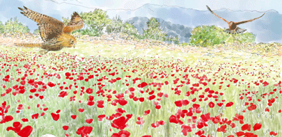 | בזים מצוים מעל שדה פרגים. בחורף ובאביב האי מתכסה במרבדי פרחים |
