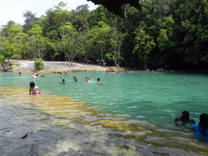 הליכה של כעשר דקות משם תביא אתכם לחוף ריילי המפורסם. לאלו המגיעים בסירה פרטית חשוב לא לשכוח לתאם מראש עם המשיט שיגיע לאסוף אתכם מהחוף השני, שכן החופים עצמם תחומים בצוקי ענק. אנו שכחנו לעשות זאת, ומכיוון שלאף אחד מאיתנו לא ממש התחשק לצעוד את כל הדרך חזרה בחום הכבד, החליט הגבר שבחבורה שהוא פשוט יעבור לשם בשחייה, וכך היה. יש להדגיש שאין בדברי שום המלצה על מעבר כזה. זה יתאים רק לשחיינים מיומנים למדי, ויש לקחת בחשבון שחיה לא קלה נגד הזרם, בעיקר עד שיוצאים מהמפרץ ומגיעים לנקודה שממנה ניתן לעקוף את הצוקים. עד שהמשימה הושלמה, הילדות ואני נהנינו לשחות ולהשתעשע בחוף היפה. שטנו בחזרה לחוף המלון, כשברקע שקיעה מרהיבה אופיינית לאזור. שחיה לילית בבריכה וארוחת ערב מאוחרת מסיימים את היום המהנה הזה. חוף רייליברכת האמרלד ושוק הלילה: עיסוי טבעי ושופינג פרועבבוקר המחרת ממתין לנו נהג הוואן עמו תיאמתי יומיים קודם לכן. כמו מרבית התכניות בטיול הזה, העדפתי לא לסגור דברים מראש, אלא להשאיר מרחב של גמישות לפי מה שיתאים לנו בשטח ולפי מזג האוויר, שלגביו הייתה אי וודאות גדולה בשל השיטפונות החריגים שהיו בדרום באותה תקופה, ושלרווחתי הסתיימו עם הגיענו. החלק הראשון של היום הוקדש לבריכת האמרלד (Sra Morakot) והמעיינות החמים (Klong Thom), משם המשכנו לשופינג באאוטלט של קראבי וסיימנו את היום בשוק הלילה המקסים של סוף השבוע. שני האתרים הראשונים הינם מקומות מתוירים ומוכרים, שמוצעים במסגרת טיולים מאורגנים על ידי סוכנויות רבות, בדרך כלל בשילוב עם מקדש הנמר (Wat Tham Seua). מאחר שהמקדש לא היה רלוונטי עבורנו (עיקר קסמו בנוף הנשקף מפסגתו, אליה מגיעים בטיפוס לא קל במעלה 1,237 מדרגות, דבר בעייתי בטיול עם ילדים), ואני אינני חובבת טיולים מאורגנים אלא מעדיפה לטייל על פי מסלולים בהם אני בוחרת, בקצב שמתאים לנו – נהג פרטי היה מבחינתי האופציה המועדפת. אני ממליצה על כך בחום, מה גם שעלות נהג עם ואן ליום שלם מקבילה פחות או יותר לעלות טיול מאורגן עבור שני אנשים, מה שהופך את העניין לכדאי אף יותר, בוודאי כשמדובר במשפחה או קבוצה של כמה אנשים. אופציה נוספת היא לשכור רכב, אולם אני העדפתי את הנהג. הפרש העלויות הוא שולי ומצדיק לטעמי את השקט הנפשי מפני תביעות אפשריות בשל פגיעה כלשהי ברכב והנוחות בכך שיש מי שיביא אותך במדויק לכל מקום ויוריד אותך בנקודה הנוחה ביותר, גם אם אין אפשרות חניה (כמו באזור השוק, למשל).