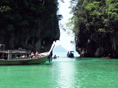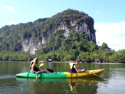 אפשרות נוספת ליום טיול חווייתי, שבו הנקודה המרוחקת ביותר אינה עולה על טווח נסיעה של כשעה צפונה, היא שילוב של ביקור במערת נטיפים מרהיבה, חתירה בקיאקים למערות עם ציורים פרה-היסטוריים ובילוי בשמורה קסומה. התחילו את הטיול בביקור במערת Tam Klang. זוהי אחת ממערות הנטיפים היפות ביותר שראיתי מימי (וכבר ראיתי לא מעט…), שמסלול ההליכה בתוכה אורך בין שעה לשעה וחצי ועובר בין תצורות מרהיבות של נטיפים וזקיפים ענקיים. את הדרך עושים בעזרת מדריך מקומי, שבעצמו מגשש ובודק דרכים עבירות בתוך המערה. אל תצפו למצוא מישהו דובר אנגלית, זהו איננו מקום תיירותי, וזה גם חלק מקסמו, אולם המקומי שמראה את הדרך מתקשר באמצעות סימנים ותנועות ידיים. פסענו בתוך מים ועל גבי קרשים ארעיים שהונחו בנקודות מסוימות, מדי פעם מטפסים מעל סלעים ומתפעלים מיפי המקום הנגלה אלינו באמצעות אלומות האור מהפנסים שלראשינו. כאן עדיין מתרגשים מאוד ממבקרים שמגיעים למקום ומבקשים מהם לכתוב בספר אורחים מהיכן הגיעו וכיצד התרשמו. אין ספק שזהו מקום מיוחד וחווייתי. משם מומלץ להמשיך בנסיעה קצרה ל-Bor Thor באזור Ao Luk, שם תוכלו לשכור קיאקים ולשוט בנופים קסומים ובין צמחיית המנגרובים. מסלול השייט עובר, בין השאר, בתוך מערות נטיפים יפות החבויות בתוך מצוקי הקארסט ומשם למערות מרשימות המכילות ציורים פרה-היסטוריים. אנו נהנינו לחתור בעצמנו בקיאקים, אולם לאלו המעוניינים בכך קיימת אפשרות לשכור את שרותיו של משיט מקומי שיחתור עבורכם. החתירה אינה קשה כלל, אולם גם אם אתם מגיעים באופן עצמאי, מומלץ להיעזר בשירותיו של מקומי שיראה לכם את פתחי המערות, שכן לבד קשה לעיתים להבחין בהם, ויוביל אתכם במסלול ההליכה הנכון בתוך המערות.
