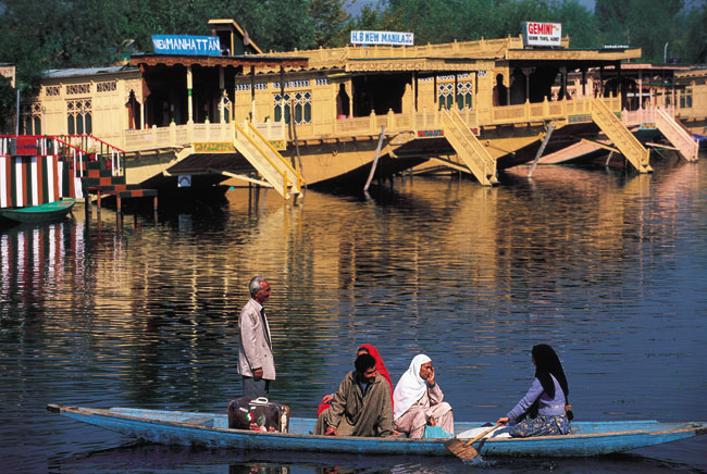 מכוונות זדוניות של השתלטות התיירים על האזור, ולכן מנעו מן הבריטים לרכוש אדמות למגורים. אך הבריטים לא ויתרו על תענוגות הקיץ ומצאו פתרון יצירתי: במקום לגור על אדמת קשמיר עצמה, בנו לעצמם סירות בית והחלו להתנחל באגמי קשמיר. סירות אלה, מקצתן מפוארות ביותר, היו לימים לשיטת מגורים פופולרית בעיקר בקרב תיירים. עד היום עוגנות מאות סירות באגמים נאג'ין (Nagin) ודאל (Dal), כל אחת פיסת בריטניה קטנה, והן תורמות רבות לאווירה הפסטורלית. אבל גם ענף הבנייה של סירות הבית שרוי במשבר עמוק מאז הידלדלה התיירות. אין תיירים — אין צורך בסירות חדשות. זאת היתה הנוסחה שחיסלה את הענף, שגם במציאות האופטימית יחסית ששוררת בימים האלה אינו מצליח להתאושש. מאז החלה הממשלה בדלהי לגלח את יערות קשמיר כדי להפוך אותם לפסי רכבת הרקיע מחיר העץ שחקים, ובניית סירות היתה לעסק לא משתלם. לא רק תיירים גרים בסירות הבית. סמוך לסירות המלון המפוארות של התיירים ההודים העשירים מצטופפים בסירות רעועות רבבות הודים. אלה מהגרים המגיעים בחודשי הקיץ לקשמיר בחיפוש אחרי מקורות פרנסה. ליד גשר אנרה קאדל אני פוגש את באלווינדו סיג', הגר עם משפחתו ועם עוד שישים מהגרים על סירת־בית שראתה ימים זוהרים יותר. חמשת בני משפחתו עובדים, אוכלים וישנים בחדר קטן תמורת דמי שכירות של עשרה דולרים לחודש: "אין לנו ברֵרה. יש לנו חלקת אדמה קטנה במזרח הודו, אך היא לא יכולה לפרנס אותנו. לכן אנחנו עובדים כאן, באריגה. לפני שירדו השלגים נחזור הביתה, שם נחכה עד שמזג האוויר יאפשר לנו לחזור לכאן".  | | הכל כלול? תיירים הודים בדרכם לחופשה על אגם דאל. טיפין טיפין הם חוזרים |