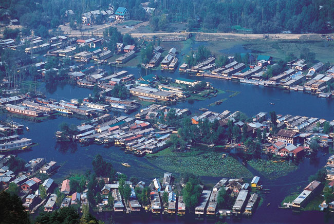 הקשמירי לסופה, לשיטפון, אבל גם לטרור, שהביא ב־1990 לבריחתם של כרבע מיליון הינדואים מעמק סרינגר להודו, מסמל את סוף עידן הדו־קיום הסובלני בין הרוב המוסלמי למיעוט ההינדואי באזור. גם הניסיון לשמור על נייטרליות נוסח שווייץ לא עלה יפה. ב־1947, ערב חלוקתה של התת־יבשת ההודית לפקיסטן המוסלמית ולהודו ההינדואית, הפגינה קשמיר היסוס שעלה לה בחלוקתה. כבן למיעוט ההינדואי נטתה עמדתו האישית של מהראג'ה הארי סינג, השליט הקשמירי דאז, להודו, בעוד נתיניו המוסלמים הזדהו יותר עם המדינה האסלאמית החדשה פקיסטן. אך יותר מכל נטיות הלב הללו רצו הן השליט והן עמו לשמור על עצמאותה ועל נייטרליותה של קשמיר. חלום זה נגנז בליל 23 באוקטובר 1947. בשאיפה לקבוע עובדות בשטח כבש צבא פקיסטן כשליש משטחה של קשמיר ונעצר רק על ידי צבא הודו, שניצל את ההזדמנות והשתלט על שני השלישים שנותרו מקשמיר. מאז ניתנה ההבטחה ההודית לסגת בתוך חמש שנים ולעשות משאל עם באשר לעתידה של קשמיר עברו כמעט שישים שנה. צבאות הודו ופקיסטן עדיין במקומם, ומי בכלל זוכר את המשאל. ואם לא די בקונפליקט שבין הודו לפקיסטן, לאחר זמן הרימו ראש גם הקשמירים עצמם. בבחירות של 1989 התפשטה השמועה על זיופים לטובת המועמדים הנתמכים על ידי השלטון בדלהי. סבלנותם של נושאי הדגל למען המאבק לעצמאות פקעה. ההתפרעויות שפרצו תפסו תאוצה ונמשכו במלוא עוצמתן האכזרית עד תחילת שנות האלפיים. סכנה ל"טוהר הגזע הקשמירי" מכל התארים שניתנו לה, התואר הקרוב ביותר למציאות הוא "ונציה של המזרח". סרינגר היא עיר שבחלקה לפחות ממוקמת על המים. הנהר ג'לום (Jhelum) מספק מים בשפע לאינספור תעלות המתחברות לשני אגמים מרהיבים בקרבתה של עיר האלים. כ־1.2 מיליון תושבי האזור משתמשים במים לצורכי חקלאות, לדיג ולגידול פרחי לוטוס, ששורשיהם נחשבים מעדן. המגורים על סירות, סימן ההיכר של ונציה ההודית, הם תופעה מאוחרת. מקורה בנוכחות הבריטית בהודו ובמזג האוויר הבלתי נסבל בַּתת־יבשת. בחודשי הקיץ הבריחו החום והלחות את האוכלוסייה הבריטית מהתת־יבשת אל סרינגר ההררית והקרירה יחסית. שליטי קשמיר היו מעוניינים אז בתיירות הבריטית כפי שהם מעוניינים כיום בתיירות ההודית, אך כבר אז חששו  | | שוויץ? לא בדיוק, גם לא בערך. אגם דאל, מבט מלמעלה |