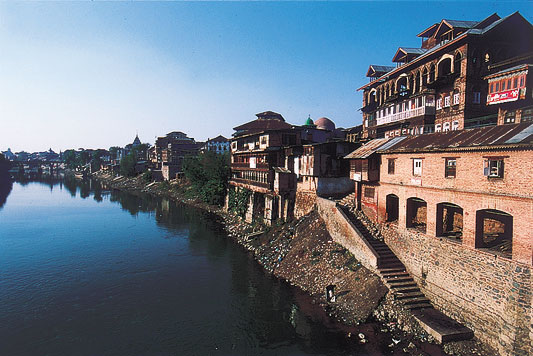 מתכסה העיר בשלגים עובר הממשל דרומה לג'מו, עיר הבירה של החורף. תקופות המעבר, שבהן הפקידים עסוקים בעצמם, הן התקופות הנינוחות ביותר של תושבי הבירות. עם רדת החשכה סרינגר מסתגרת בבתים. הרחובות החשוכים שייכים לחיילים המפטרלים, ואיש אינו רוצה להיקלע למצב שבו חייל הודי נבהל מרעש בלתי מזוהה. החשש מפיגועים מחויב המציאות, ותגובות החיילים לעתים קרובות אימפולסיביות למדי: קודם יורים, אחר כך בודקים. בהיעדר בילוי חלופי אני מבלה את הערבים כדייר היחיד בסלון המרווח של סירת־הבית. רהיטי עץ כהים ווילונות כבדים מזכירים לי את השורשים האירופיים של צורת מגורים זו, אך יש מי שמזכיר לי שאני לא בבריטניה: ברצינות מעוררת רחמים מבטיח צוות הסירה בכל יום שמחר יזרום החשמל. אבל המחר נשאר תמיד מחר, ולרוב אני יושב לאור נרות ומקשיב לשקט. אסור לטעות בסגנון ההליכה בליל אוקטובר קר וערפלי אני עומד על גדות אגם נאג'ין וממתין למונית. בלילה השחור הזה אין כוכבים ואין ירח, ועל חשמל כמובן אין מה לדבר. בקושי אפשר להבחין בסירת העץ הגדולה שהיתה לביתי בימים האחרונים. אלה הם הימים האחרונים של חודש הרמדאן. השעה היא חמש לפנות בוקר, וקולות המואזין עדין בוקעים מתוך אינספור מסגדים ומרחפים מעל למים השלווים של האגם. האסלאם הופץ באזור רק במאה ה־13, כאשר שאה חמדאן הגיע לעיר. בתוך  | | העיר העתיקה, מבט מנהר ג'לום. כאן, מן הסתם, רואים הרבה פחות תיירים |