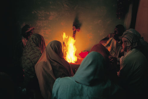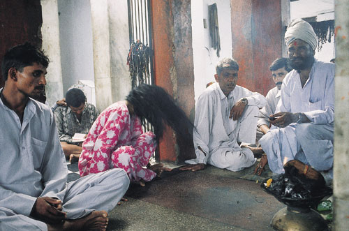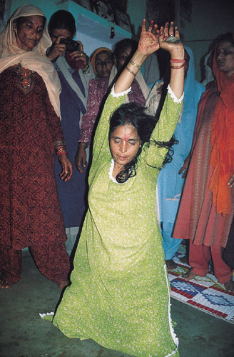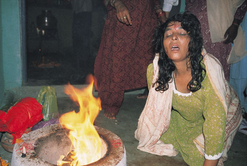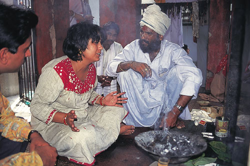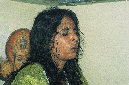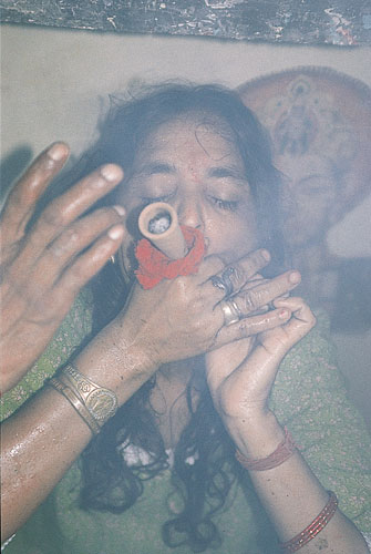 אכזבו את הקהל הממתין להן. מפיה של אלמנה אחת נשמעו קולותיהם של בעלה המנוח ושל אשתו השנייה, שנפטרה אף היא. הבעל סיפר שנישא לאשה השנייה רק בשל בעיות ממון, ובכה על שהוא רוצה להמשיך לחיות את חייו עם אשתו הראשונה. האשה השנייה סיפרה שהיא שבה כדי לנקום על כך שבעלה העדיף את אשתו הראשונה על פניה. מפיה של נערה אחת שמעתי רוח בוכה בכי מר על חברה שנעלם, ועל כך שהיא מגורשת מכל מקום. מפי גבר נשמעה רוח מתריסה שאין חזק ממנה ושאיש לא יוכל לה, מה שהצחיק מאוד את הגורו, שנראתה משועשעת מאוד מהמפגשים הללו. בשלב זה קרבו אליה המטופלים. היא השמיעה דבריה בלחש. ברוב המקרים היא אבחנה את הבעיה. כך גילתה לאשה אחת שהרוח מקיימת עימה יחסי מין ולכן לא מוכנה לעוזבה, ולנערה צעירה אחרת סיפרה שהרוח מנסה להורגה לאחר שכבר הרגה שניים מבני משפחתה. האנשים הנהנו ואמרו שזה נכון. הנערה פרצה בבכי קורע לב. עקרת בית בטראנס כשנרגעה, הובלה לחדר קטן סמוך, המשמש כפינת פולחן ביתית, והתיישבה בישיבת לוטוס. צ'ילום (Chillum, מקטרת חרס) ממולא בצ'ארס הוגש לה והיא עישנה אותו באחת. ראשה היה אפוף בענן עשן סמיך, שבתוכו נעלמו ידיה האוחזות במקטרת, ורק קצה הציץ ממנו. כאשר סיימה לעשן המשיכה להתנשף. כשבגדיה ספוגים זיעה נוטפת וצמודים לגופה, בירכה את המאמינים. לכל אחד מהם הבטיחה רפואה שלמה, ובטרם שילוחם מעליה העניקה להם פרי. |
