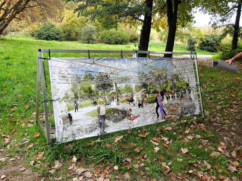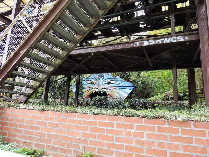 אנחנו מסתובבים בעקבות המדריך בין המתקנים השונים. למרות מה שקראתי, הגלגל כבר איננו, כנראה פורק. אני חושב על הצילום שהחמצתי: גלגל ענק המיתמר בין צמרות העצים. אבל התמונות במקום מרתקות. עצי הדולב, האשור והאלון ואולי גם ערמונים פה ושם – ניחוש משכיל, עוטפים את המתקנים בירוק. תראו את קרוסלת הילדים המסתובבת, את עלי השלכת המכסים את בריכת המים, או את המפלצת הכחולה שמגיחה בין השיחים. והנה שלט גדול הנושא ציור צבעוני שמראה תמונה רחוקה של ימים אחרים. השומר החיפאי הולך כל הזמן כמה מטרים מאחורינו כאילו משגיח שלא ניגע במתקנים, או שאלה לא יגעו בנו.
