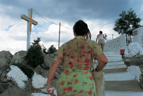 אחווה נשית עלומה שמונה בספטמבר, יומה של צמביקה, בוקר צלול של ראשית הסתיו. אנחנו מטפסות במעלה המדרגות החצובות בהר בדרך למנזר, מבנה לבן וצנוע בראש צוק הניבט אל מפרץ צמביקה, שנחשב לאחד החופים היפים ברודוס כולה. חורש ים תיכוני: אורן, ברוש, אלה, חצבים לבנים של סתיו. בימים העתיקים היה היער הזה מקודש לארטמיס, אלת הציד והיערות במיתולוגיה היוונית. איכשהו התמזגה ארטמיס, בתולה אינדיבידואליסטית שלא ממש חיבבה גברים, עם הקדושות הרחומות והאמהיות של הכנסייה היוונית־אורתודוקסית. 295 מדרגות במעלה ההר נותנות הרבה זמן למחשבות. למה, למשל, נשים מבקשות פרי בטן דווקא מאלות בתולות כמו מריה וארטמיס? למיסטיקה היגיון משלה. גם בארץ עולים  | חצר הכנסייה הכפרית למרגלות ההר. טקסי החג של צמביקה כוללים, בין היתר, את נישוק הצלב שמתחת לעץ הגדול בחצר. בזה אחר זה עולים נשים וגברים ורוכנים על המזבח |