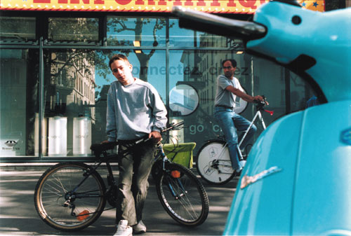 רוכב האופניים מאחור: "אני ממהר עכשיו, כי אני מאחר לאסוף את הבן שלי מבית הספר. לרוב, אני בכלל לא יודע מה זה לאחר – והכל בזכות האופניים. בשבילי, רכיבה על אופניים היא אמנות החיים. היא מאפשרת לי להיות תמיד בכושר ולהיות עצמאי, לא תלוי באחרים, שזה נדיר בעיר כמו פריז, שבה התנועה והפקקים הם ממש שיגעון. "האופניים שאני רוכב עליהם הם מודל יחיד במינו. אני ממציא בשעות הפנאי, והאופניים האלה הם קונספט שאני פיתחתי, שגם זכה בפרס של תחרות לכלי רכב אלטרנטיביים. מאחור בניתי תא קטן נגרר, שבו אני מאחסן את כל ציוד העבודה שלי – כיום אני עובד בקולנוע, אפקטים מיוחדים, אבל עבדתי בעשרות עבודות שונות בחיים שלי, ובכלל אני עושה אלפי דברים. יש אנשים שקוראים לי "שמאן אורבני". מלפנים, יש לי מושב קטן לנוסע אחד, לרוב הבן שלי. טוב, זהו, אני חייב לנסוע, אני צריך לאסוף את הילד שלי מבית הספר, להתראות". רוכב האופניים בחזית: "קוראים לי מתאו, אני בן 12, ובימים כמו היום, שאני לא הולך לבית הספר ואין לי משהו מיוחד לעשות, אני בא לכאן, ברולר בליידס או באופניים. בפריז, כולם נוסעים עכשיו ברולר בליידס, ושדרות דומניל הן מקום מצוין לכל מה שיש לו גלגלים. אני רוכב על אופניים מאז שאני בן חמש, ואת האופניים האלה יש לי כבר שלוש שנים. בסופי שבוע, אני יוצא לרכוב גם בפארקים, עם אבא שלי ועם הבני דודים שלי. אופניים זה שיגעון משפחתי, אבל בכל זאת, אני מעדיף רולר בליידס".