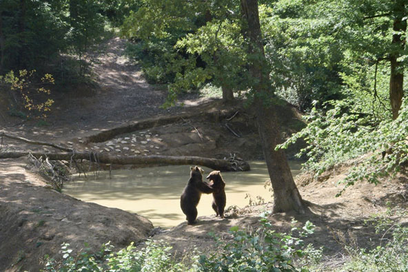 3. דובי החופש בעיירה זארנשט (Zarnesti) שבאזור בראשוב במרכז טרנסילבניה, תוכלו ליהנות מחוויה ייחודית המשלבת טבע עשיר, בעלי חיים וגם כמה ערכים חשובים. שמורת הדובים (Libearty Bear Sanctuary) היא ביתם של כ-70 דובים, החיים בחופשיות על פני עשרות דונמים של יערות ירוקים. לשמורת הדובים סיפור מעניין, שמתחיל אי שם לפני כ-17 שנים, באישה מקומית ואמיצה שהצילה שלושה דובים מכלוב קטן. כיום, מדובר בשמורה נפלאה מלאת עצי אלון ואורן, בריכות ושלל מתקנים. במקום נערכים סיורים מודרכים, ניתן גם לצפות בדובים מנקודות תצפית מחוץ לפארק. כתובת: Libearty Bear Sanctuary, Zarnesti שניים מדיירי בשמורת הדובים. הדובים יכולים לנוע בחופשיות בשטח המיוער | צילום: Libearty Bear Sanctuary ©