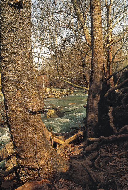 | נחל שניר גועש באמצע ינואר. את הדרך בשמורה מלווים צמחייה צפופה ושאון מים שוצפים |